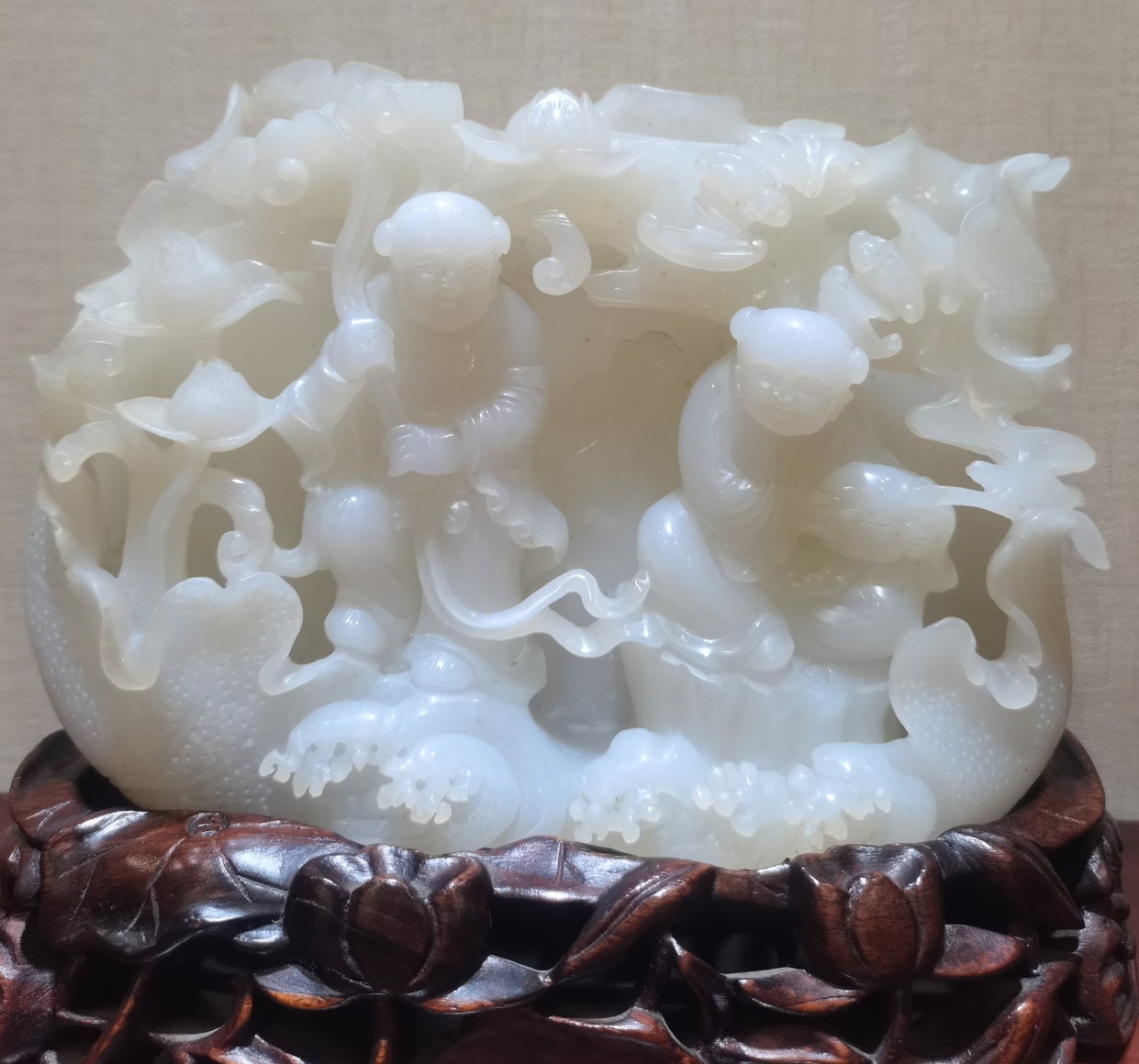 “合和二仙”象征“家庭和合,婚姻美滿”,進而延伸為“和合文化”、“和諧社會”、“和平世界”。此款擺件做人物件對料要求很高,將二仙歡樂暢快的情緒表現的尤為生動有趣,一人持荷,一人捧盒,惟妙惟肖;流露出喜氣洋洋的祥和氣韻,遍福飛繞,感染力強。作品對人物的形態動作,面部表情拿捏的十分準確,鏤空雕刻,雕工精湛,線條洗練,是一件工料具佳的和田玉擺件作品。