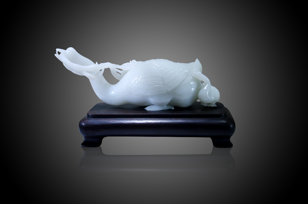 不鳴則已,一鳴驚人,故此而得名為《名甲天下》。作品通體雪白無暇、晶瑩飽滿、細膩滋潤,玉質溫潤,色度均勻,鵝頭造型簡潔大氣,鵝身厚重沉穩,呈挺胸伏臥狀,神韻兼備,極具感染力。整體紋飾簡潔形象,雕工質樸而不失精美。為饋贈收藏、賞玩怡情的佳品。