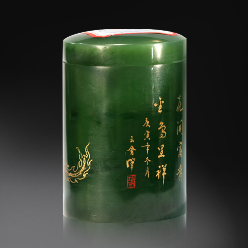 編號:0H1101-002 以上品碧玉琢成,玉質溫潤細膩,色澤沉穩,器型規整圓潤,在布局上講究起承轉合,盒蓋和筒身淺浮雕詩文和花紋,字跡秀雅,線條婉轉雅致,雕琢精美秀麗,透露出古樸的氣息。細節刻畫上一絲不茍,整件作品的制作工藝嫻熟精湛,精致唯美,體現出了極高的工藝水平。