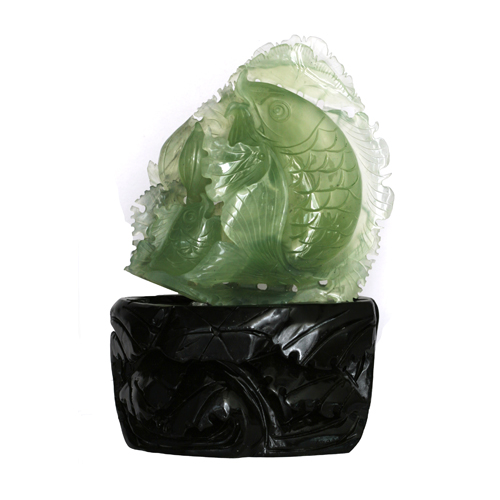 以天然岫玉琢制魚兒及蓮花,魚兒戲蓮,有較好的觀賞效果。玉質(zhì)清新、綠色鮮嫩,款形大小適中,擺放于案頭閑時(shí)欣賞,帶給您一份美好的心情。魚通余,蓮諧音連,寓意連年有余。