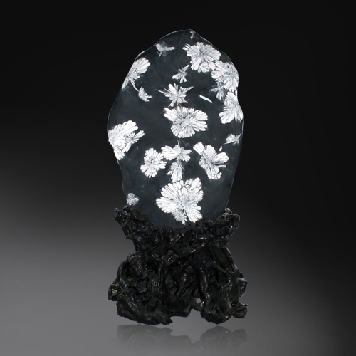 天然菊花石是瀏陽河天青石中含凸鏡狀灰巖,經數億年地質變化,演變而成。乳白色天然花形,酷似盛開的朵朵菊花,紋理清晰,界線分明,質地堅實,花形千姿百態,蔚為奇觀,潔白美麗的花瓣是由天然的天青石和方解石組成。中華人民共和國地質礦產部將其列入寶石類,并命名“玉疊妃”。因其蘊量稀少,比珠玉寶石類更珍貴。故又被稱為“全球第一”。 菊花石的發掘,雕刻成工藝品,則始于清乾隆年間,當時只作宮庭貢品,后才在民間流傳。一九一五年巴拿馬萬國博覽會上,菊花石雕“梅、蘭、竹、菊”橫屏參展,榮獲金獎,震驚世界,驚嘆“石頭能開花”,從此享譽全球。